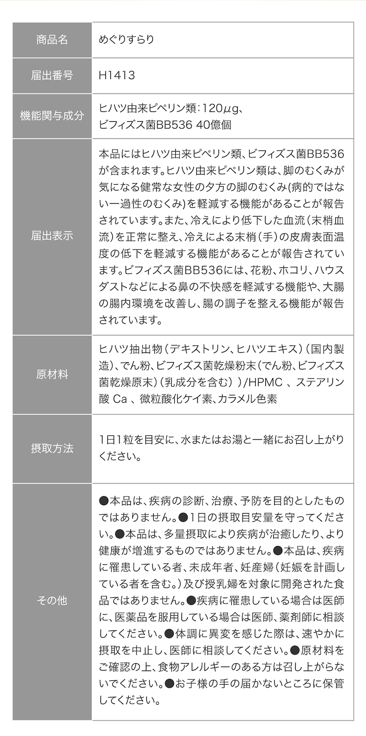 4つの特典つき 女性の多くが持つ悩みを聞いたことがきっかけで生まれた商品です 女性従業員の多くが同じ悩みを持っていることがわかり… 体質や年齢を理由に諦めたくない悩みを解決できるような機能性サプリを いつも健康でありたいと願うあなた様のお守りとして めぐりすらりが選ばれる3つのポイント 機能性関与成分「ヒハツ由来ピペリン類」が血流を整えむくみ・冷えを軽減